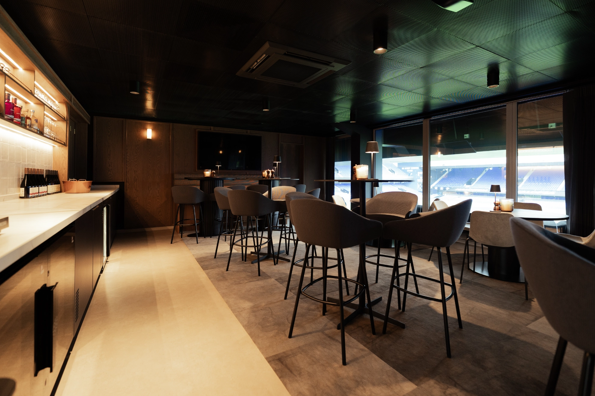 The design strikes a balance between traditional elegance and a contemporary edge, creating a space that hosts match-day events with pride, offering panoramic views of the pitch and a refined, memorable atmosphere for every guest.