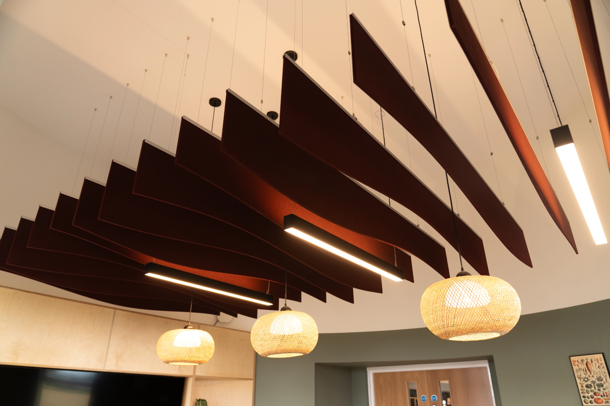 The furniture is wipe-clean, hardwearing, and comfortable, with integrated power for meetings and window tables offering views across the fields; the lighting blends natural light, accent lighting, and neon elements; CORE TP equipped the space with a full sound system, projector, and screen to enhance everyday functionality; and the Autex Talus ceiling raft has significantly improved the boardroom’s acoustic quality.